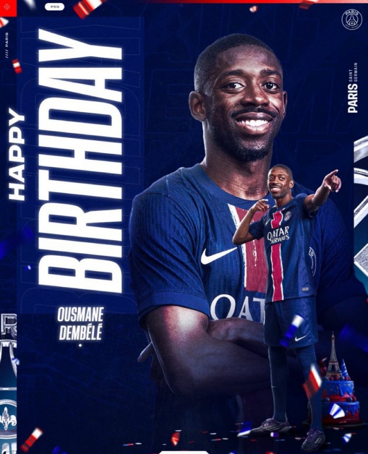 5月15日讯 今天是登贝莱28岁生日,巴黎官方也为这位球队锋线核心送上生日祝福。