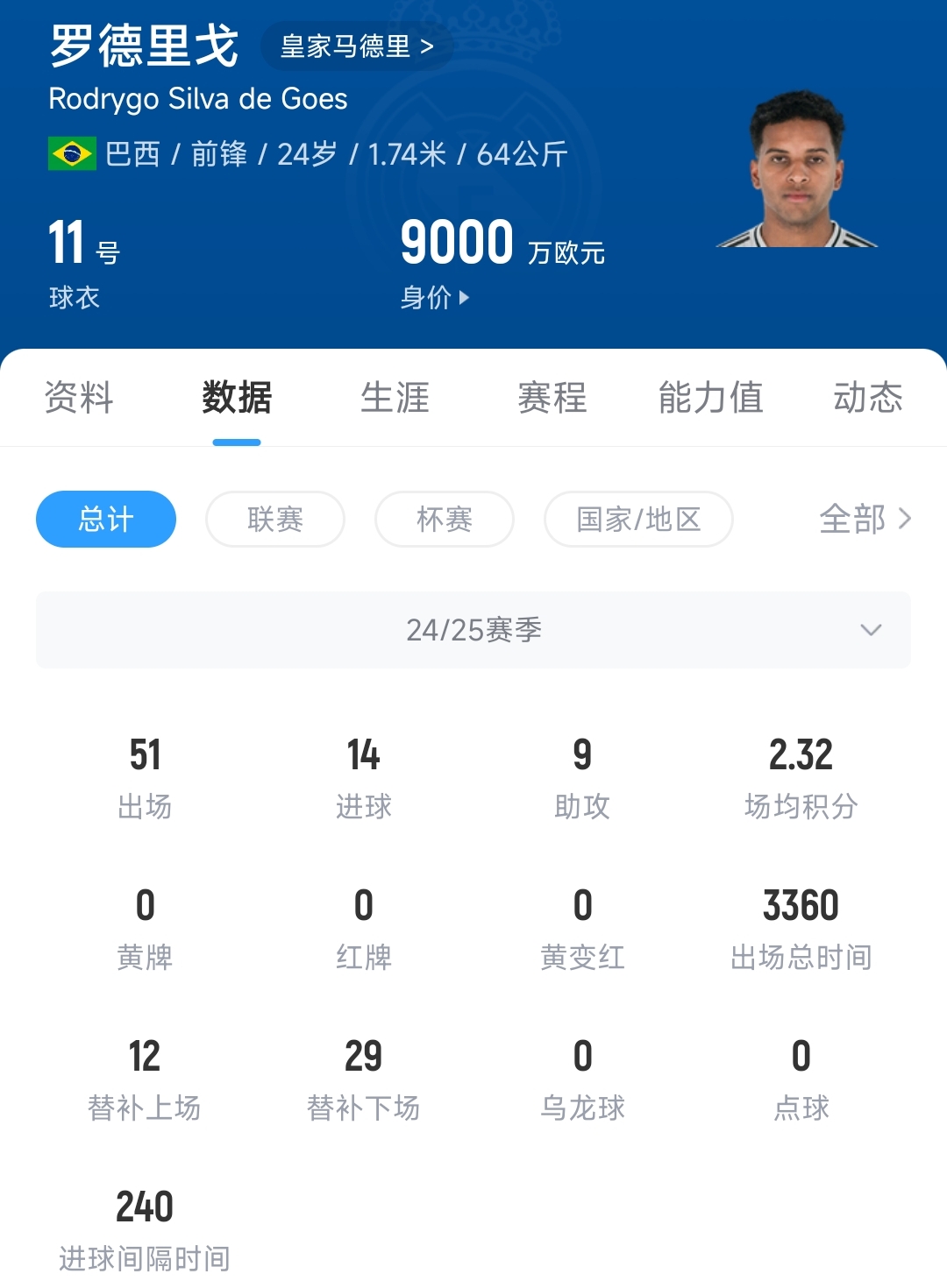 24岁的罗德里戈身价下跌1000万欧元,由1亿欧跌至9000万欧;本赛季罗德里戈代表皇马出战51场比赛,贡献14粒进球和9次助攻。