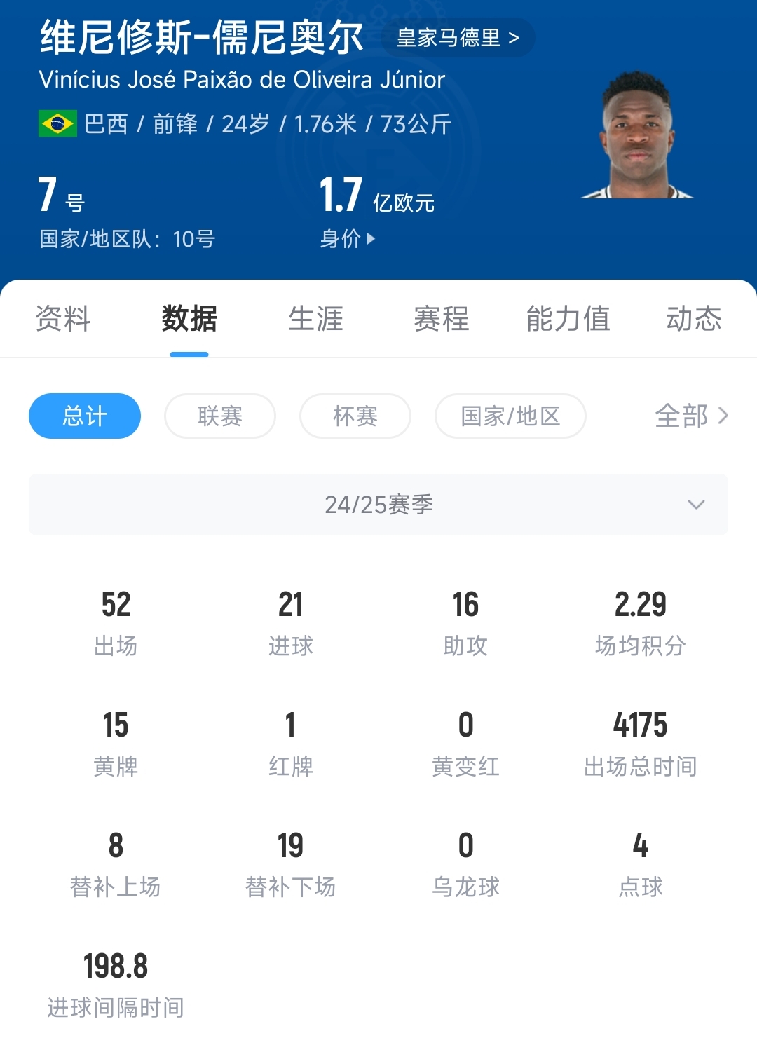 24岁的维尼修斯身价下跌3000万欧元,由2亿欧跌至1.7亿欧;本赛季维尼修斯代表皇马出战52场比赛,贡献21粒进球和16次助攻;