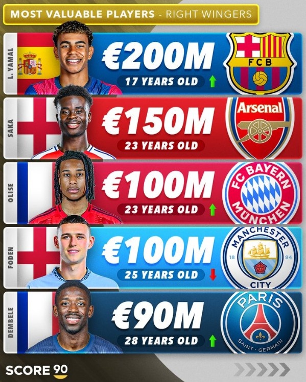 6月13日讯 2024-25赛季结束, Score 90更新了右边锋的身价排行,巴萨的亚马尔以 2亿欧元排名第一,阿森纳攻击手萨卡 1.5亿欧元第二。